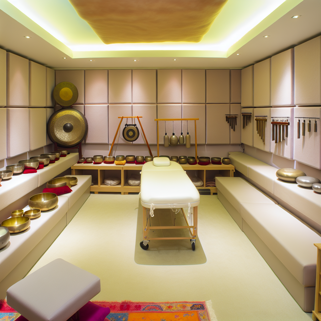 Качественный звук — главный инструмент клангмассажа. Для достижения чистого, насыщенного звучания чаш необходимо обеспечить хорошую звукоизоляцию стен, потолка и дверных проёмов. Внутри перегородок используют минеральную вату или акустические плиты, на поверхности стен монтируют звукопоглощающие панели, а под дверями устанавливают уплотнители и шумоизоляционные пороги. Такой подход предотвращает проникновение внешних шумов и минимизирует эхо внутри помещения.